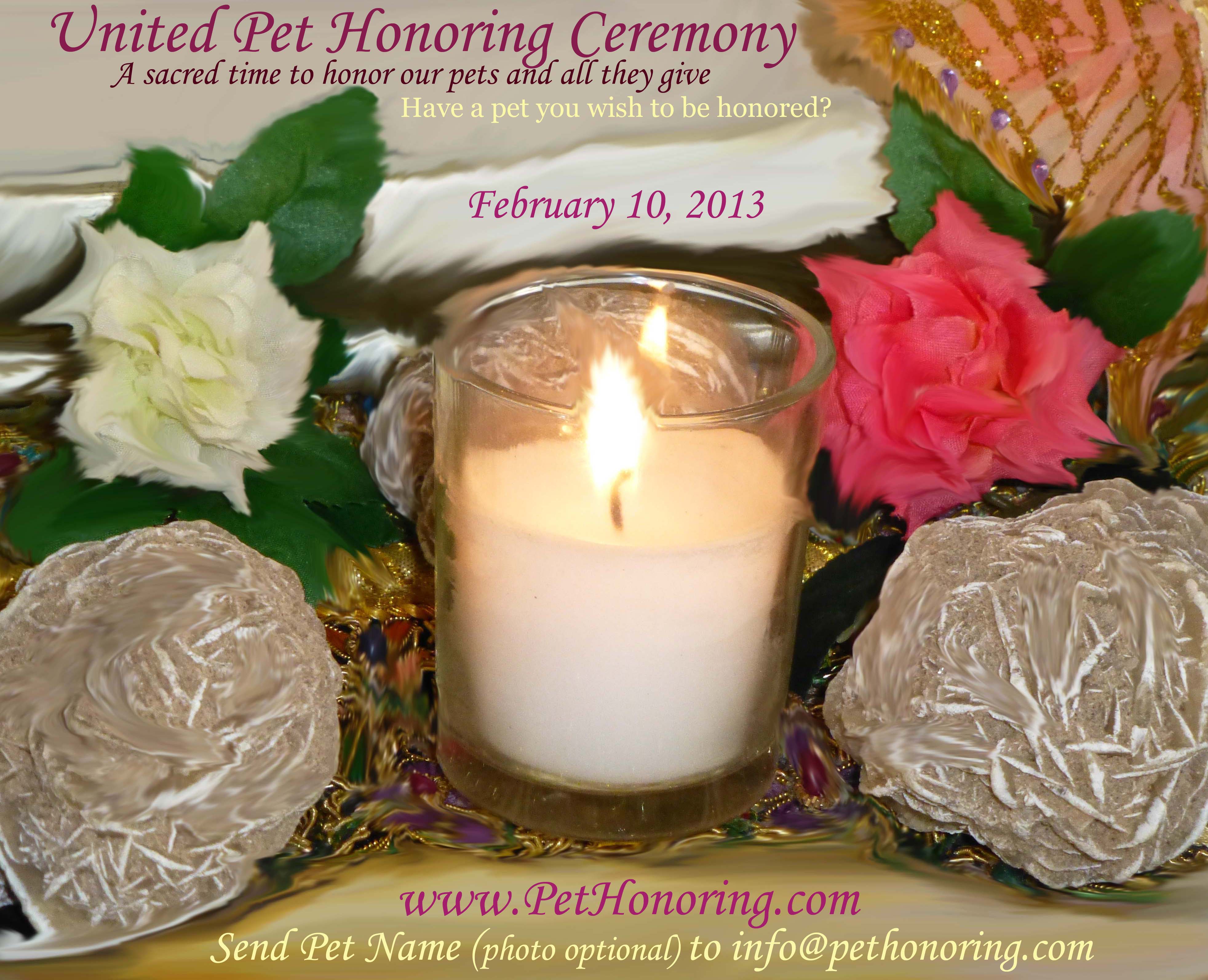 Send in Pet Name (photo optional) Testimonial: “it was last year when you were SO KIND as to honor her. I’m still so very grateful. It seemed to allow my heart to stop aching. Now I have two dogs and each has such a distinctive personality. Thank you for all you do.”NEW:Pet Honoring Ceremonies are a way to have sacred time to honor our pets and loved ones, our relationship with them, and all they give us. Honoring prayers are sent to those listed and their families. Each name is said out loud and given an individual blessing of love, honoring and healing for the highest good. The divine essences of their spirit and soul is acknowledged, honored and sent love.